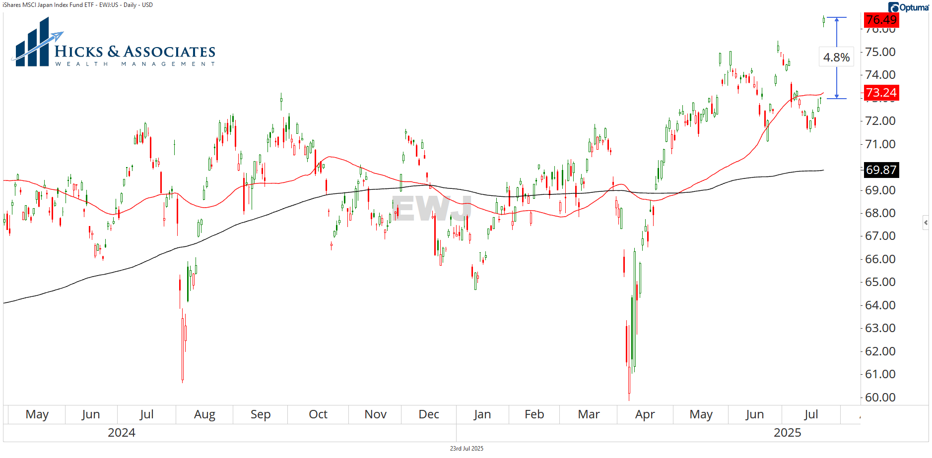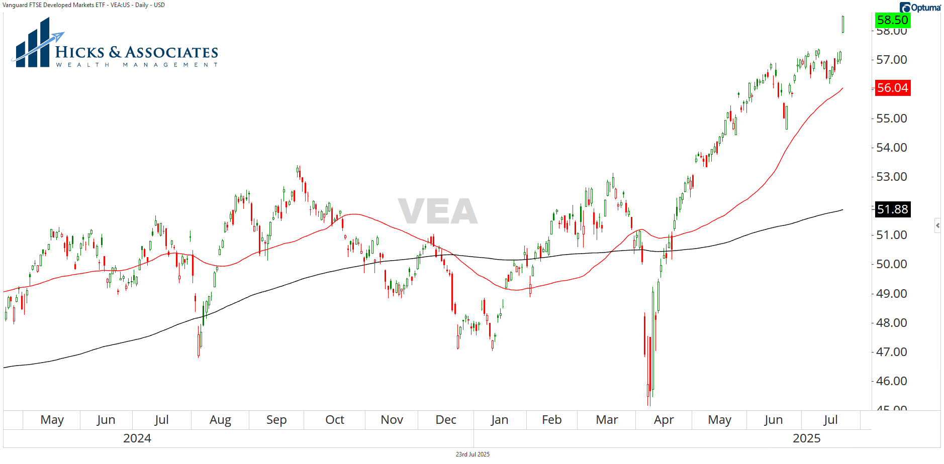 While we like what we see with the small-cap ETF, do not ignore the international space. Chart 2 is VEA, the Vanguard Developed Markets ETF. Yesterday, it rocketed higher on the back of the news of President Trump’s trade deal with Japan. We’ll take a look at that in our third chart.
