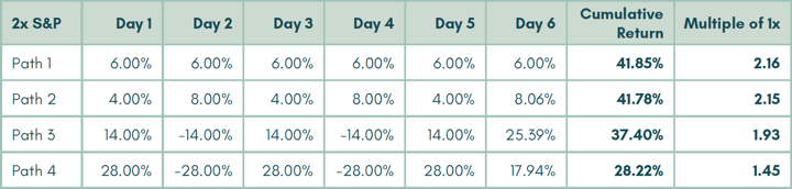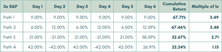 High volatility and seesawing action are the enemies of leverage, while low volatility and streaks in performance are its friends. We can see this clearly in Table 3. With the same unleveraged cumulative return of 19.41%, the four paths illustrated have different leveraged returns. In both Path 1 and Path 2, the S&P 500 is positive for six consecutive days, but the lower volatility Path 1 achieves a higher return. Both Path 1 and Path 2 perform better than the leverage multiplier as the constant re-leveraging benefits from compounding. The opposite is true in Path 3 and Path 4, which have alternating positive and negative returns during the first five days. These paths fall directly into the constant leverage trap and the highest volatility Path 4 is hurt the most when leverage is applied.
