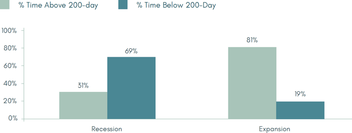 We propose that there is a fundamental underpinning to this stark differentiation in behavior. Since 1928, the U.S. economy has experienced 14 recessions, spending approximately 19% of the time in contraction. In Chart 2, we see that during recessionary periods, the S&P 500 has traded below its 200-day Moving Average 69% of the time versus only 19% of the time during expansions. During expansionary periods, the S&P 500 has traded above its 200-day Moving Average 81% of the time versus only 31% of the time in recession. The uncertainty in growth and inflation expectations that accompanies periods of economic weakness is, in our view, what leads to investor overreaction and increased beta volatility.