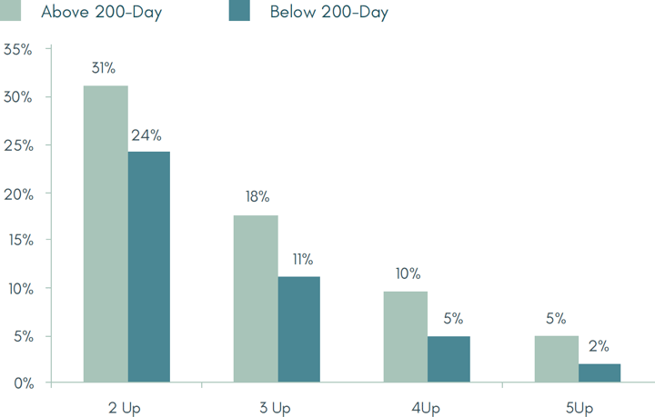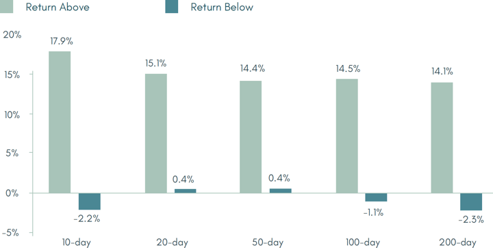 - We find that Moving Averages are an effective way to identify such environments in a systematic fashion. When the broad U.S. equity market is above its Moving Average, stocks tend to exhibit lower than average volatility going forward, higher daily average performance, and longer streaks of positive returns.