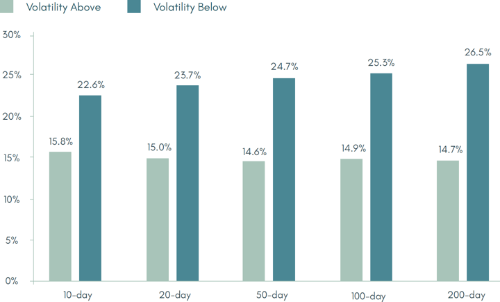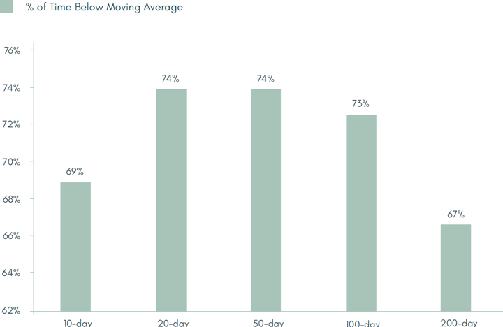 - When below its Moving Average, the opposite tends to be true, as volatility tends to rise, average daily returns are lower, and streaks in positive returns become less frequent.