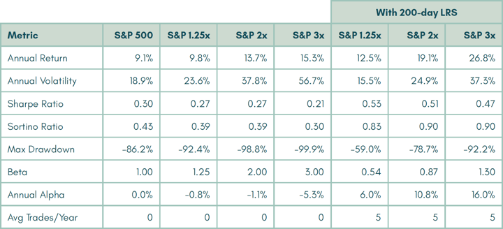 Alternatively, by incorporating the LRS, we can harness the power of leverage while increasing the odds of an investor sticking to the portfolio over time. Although shorter Moving Averages achieve similarly strong results, we will narrow our focus here to the 200-day Moving Average as it incurs the fewest transaction costs (average of 5 trades per year) and is most applicable in time frame to both traders and investors. We will also assume for the purposes of this section a leverage fee of 1% per year, which approximates the current expense ratio for the largest leveraged ETFs.