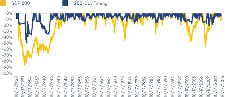 Chart 6: S&P 500 vs. 200-day Timing, Rolling Drawdown