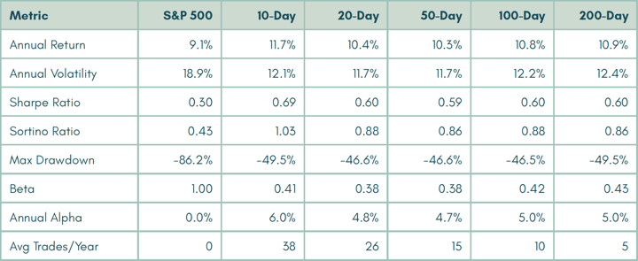 Before illustrating the results of the LRS, it is important to examine how unleveraged timing based on the Moving Average alone performs going back to 1928. The data is summarized in Table 6. Note that the Moving Average rule results in higher risk-adjusted performance and lower drawdowns versus buy and hold, generating significant positive alpha in all Moving Average periods examined (10-day through 200-day).