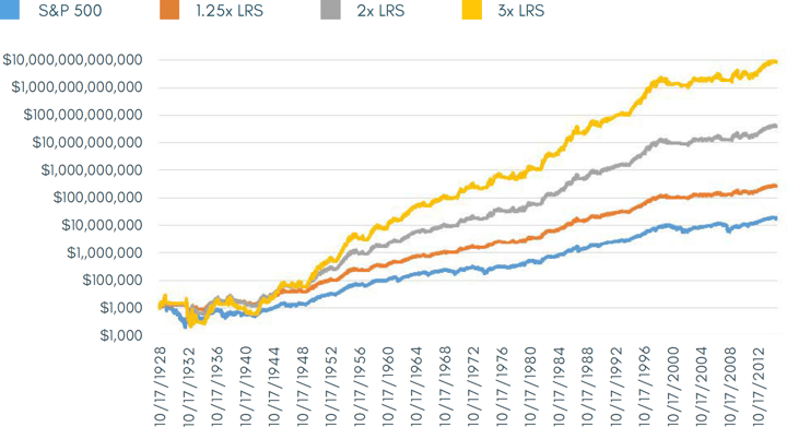 Chart 8 displays the growth of $10,000 from October 1928 through October 2015. A buy and hold of the S&P 500 grows to over $19 million while the 1.25x, 2x and 3x LRS grow to over $270 million, $39 billion and $9 trillion respectively.