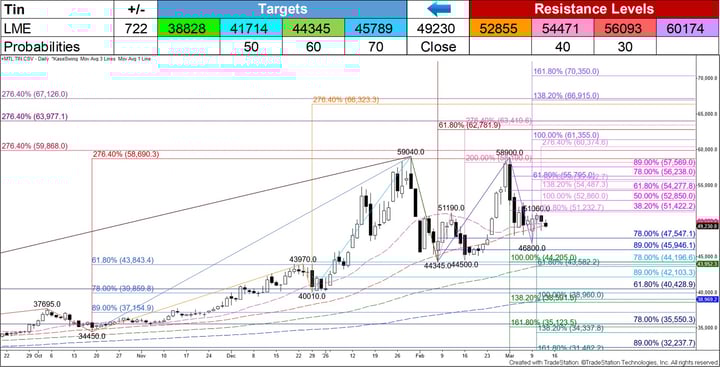 Tin finally settled below the 20- and 50-day moving averages on March 12, but it has been a struggle to do so for the last few days. The close below the 50-day moving average was marginal, so there is still a chance that this will prove to be an area of support. Should prices rise again and close above the smaller than target of the wave up from $46800 (violet) and the 38 percent retracement from $58900 (magenta) at $51385, look for a test of the equal to target and 50 percent retracement at $52855. This then connects to the intermediate (1.382) target and 62 percent retracement at $54471 and then key resistance at $56093. The $56093 level is key because this is the larger than (1.618) target of the wave up from $46800 and the smaller than target of the largest wave up from $44345 (medium purple). Settling above $56093 will call for a move above the $59000 double top to challenge $60174 and higher.