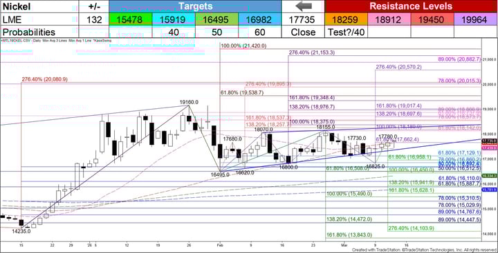 Nonetheless, given the close above the $17662 smaller than target of the wave up from $16800 (violet) and the recent close back above the 20- and 50-day moving averages, there is a reasonable chance for a test of key resistance at $18259 first. This is the most confluent level on the chart and is near the upper trendline of the pennant. Settling above $18259 will shift the odds in favor of nickel rising to $18912 and higher.