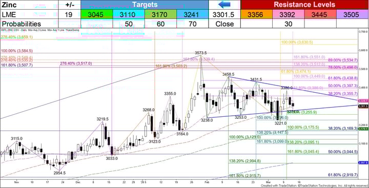 Should zinc rally again and close above the 38 percent retracement from $3573.5 (magenta) at $3356, look for a test of key resistance at $3392. This is the 50 percent retracement and the smaller than target of the wave up from $3221 (violet). Settling above $3392 will confirm a break higher out of the symmetrical triangle and put the odds in favor of zinc rising to $3445 and then another highly confluent area of resistance around $3505 that has already been challenged and held on a closing basis.