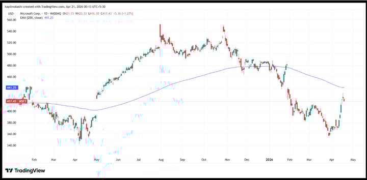 Microsoft (MSFT), near $422 against an all time high of $552, remains 24% below its peak. Despite a 14% rebound, it has barely reclaimed its 200 day moving average, facing thick resistance overhead. A lagging heavyweight in a record breaking index sends a warning worth noting.