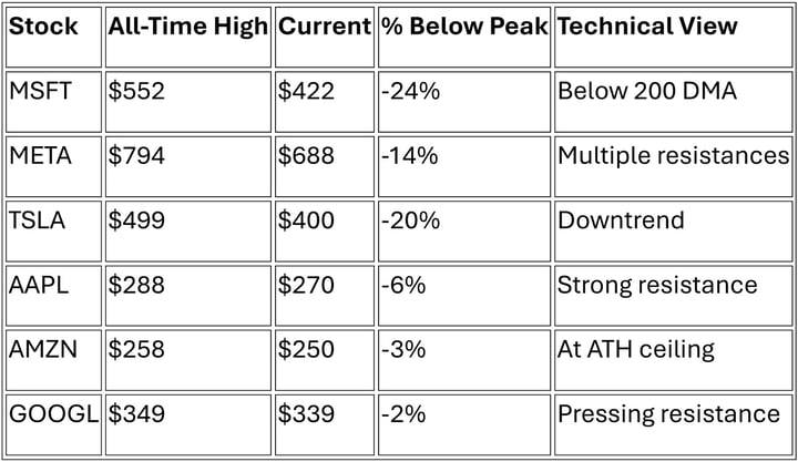 “Nasdaq hits record high” sounds like a market in full bloom — broad confidence, strong leadership, and investor euphoria. But what if the headline hides the truth? What if the very stocks that powered the Nasdaq’s rise — Apple, Microsoft, Alphabet, Tesla, Meta, and Amazon — are still far from their own highs and pressing against tough resistance? That disconnect is what technical analysts call a breadth divergence, and history shows it matters.