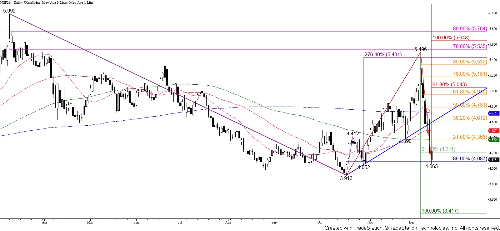 The prompt month January 2026 natural gas contract failed to extend the trend up from $3.913 and overcome an important $5.38 target again. Instead, prices gapped down on Monday and confirmed daily bearish momentum oscillator divergences and daily and weekly overbought signals. Prices fell aggressively for the remainder of the week. The bullish trendline up from $3.913 was broken, the last major swing low at $4.390 was taken out, and January settled the week below a bearish decision point at $4.21. The trend is now bearish, and a ‘nice’ market will challenge at least $3.96 early in the week. Settling below this will call for tests of the next major targets at $3.69 and $3.45 within the next few weeks.