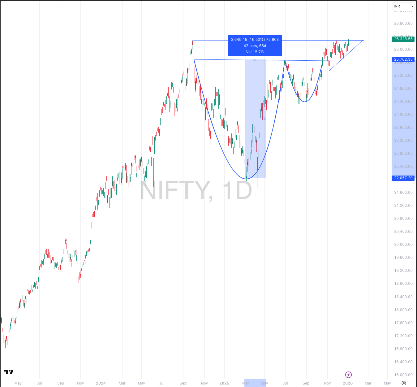 After 15 months of grueling consolidation following the September 27th highs, the Nifty 50 is flashing signals of a major structural shift. The index appears to be breaking out of a classic Cup and Handle (C&H) pattern, a bullish formation that often precedes significant momentum.