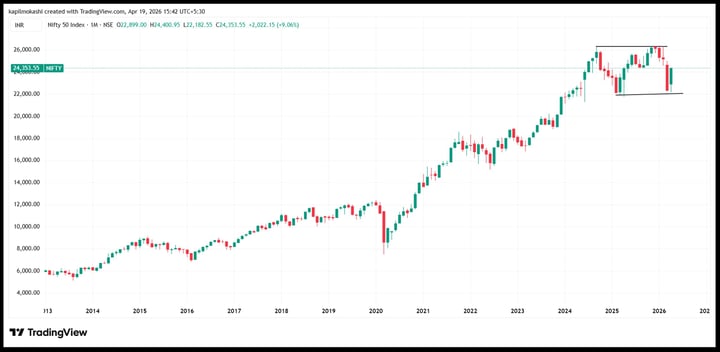 April 2026 marked a bottom for the Nifty Index,from where it rallied close to 10%. Since we fell almost 20% from the top of 26341 on 3rd Feb 26, this essentially means we are approximately standing at 50% retracement of the previous fall. The obvious question on every investor’s mind is: