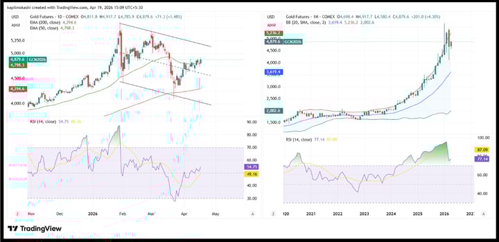 On the monthly chart, an engulfing bear candle in March 2026, appearing in an overbought environment at an extended upper Bollinger band does suggests Gold may remain range-bound in the near term. On the daily chart, a downward sloping parallel channel indicates a possible bounce toward 5180-5200 zone (lower high region). A decisive breakout above the channel, would force a reassessment of sentiment.