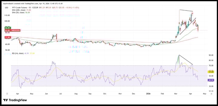 Technically, while Iran-US geopolitical tensions remained elevated, crude had already started giving early warning signs of fatigue. On 7th April 2026, WTI crude made a near similar high around $118, while RSI formed a lower high — a clear negative divergence.