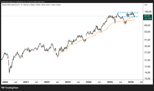 ARGT has the most compelling long-term chart of the three assets covered today. The trend is intact, and the bullish bias holds as long as price remains above the VWAP (~$75). That said, the $87–$100 range represents the ETF’s all-time resistance ceiling — breaking through it convincingly would likely require a strong fundamental catalyst, most probably further confirmation of the Argentine economic program’s success or a sovereign credit rating upgrade.