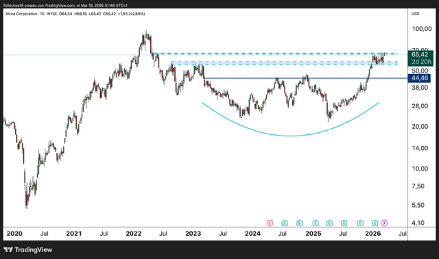 AA presents one of the most compelling technical structures in the market right now. The 2.5-year Rounding Bottom is complete and activated; price is challenging the final layer of historical resistance, and the fundamental catalysts — tariffs, industrial demand, and the energy transition — are all aligned. A weekly close above $70 would confirm the breakout and set the long-term target at $90–$100.