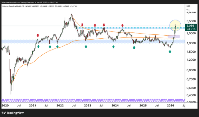 RBOB gasoline futures are currently testing a multi-year resistance zone following a sharp momentum-driven rally. While the technical structure suggests a potential regime shift from range to trend, the broader macro backdrop—characterized by rising supply, weakening demand expectations, and a downward-sloping forward curve—indicates that the current move may be more tactical than structural.