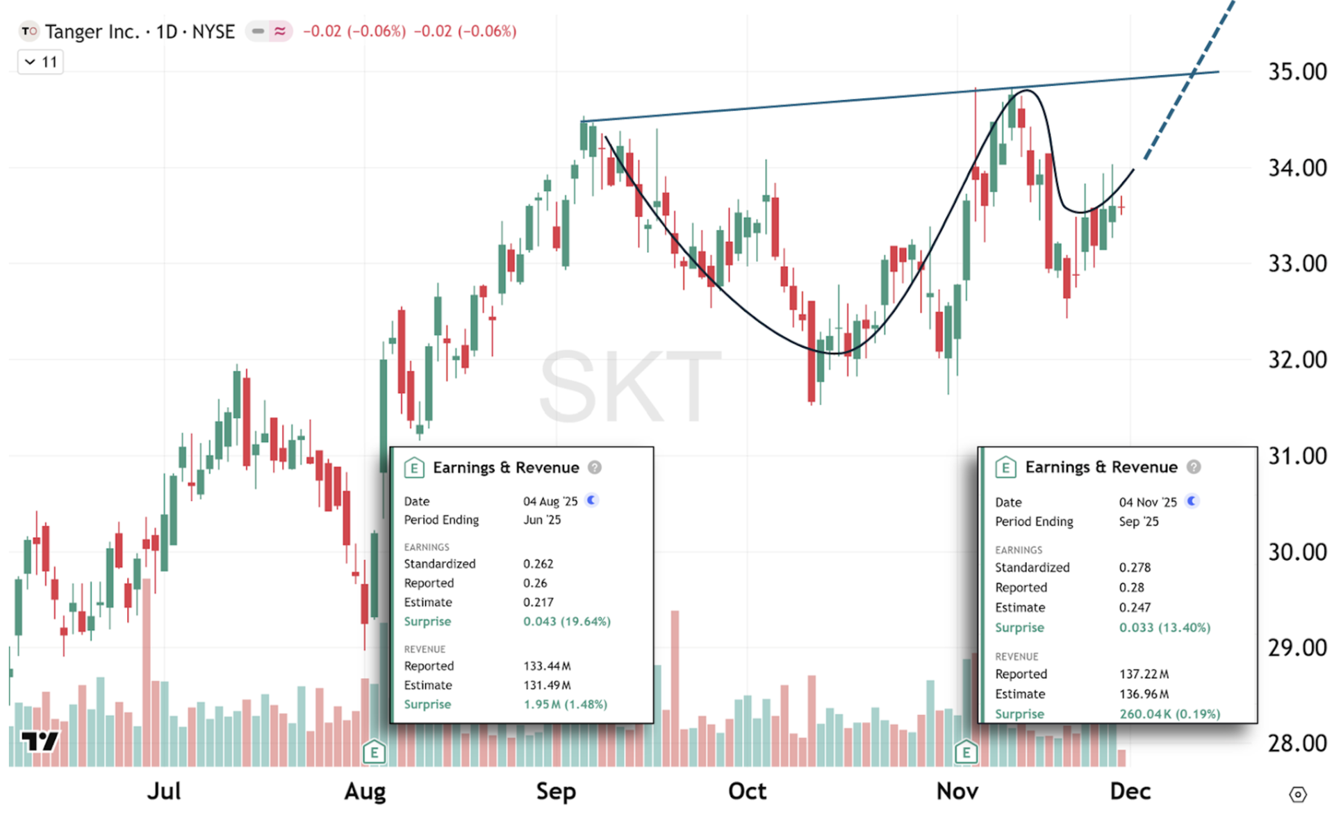 Tanger Inc. (SKT) may be small-cap, but don’t let that fool you — it’s backed by a big-brand outlet empire. This chart is also shaping up into its own cup and handle pattern, but it is a few days behind SPG, making it a more attractive ticker to research. If its fundamentals you like, then you’ll like what you find over the past two quarters.