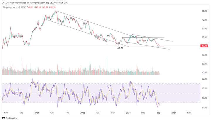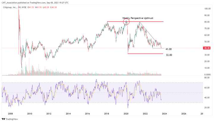 Citi is also on my watch list. Following a long decline (see weekly) and after absorbing the supply along the downtrend line via a lateral trading range, it has now retreated into a good support zone and is quite oversold. Because of the trading range dynamics, it’s my suspicion is that it will move closer to 32 before producing a tradable spring. However, I am open to the idea that this smaller range may present a terminal spring and will be alert for setups to take advantage if it does so.
