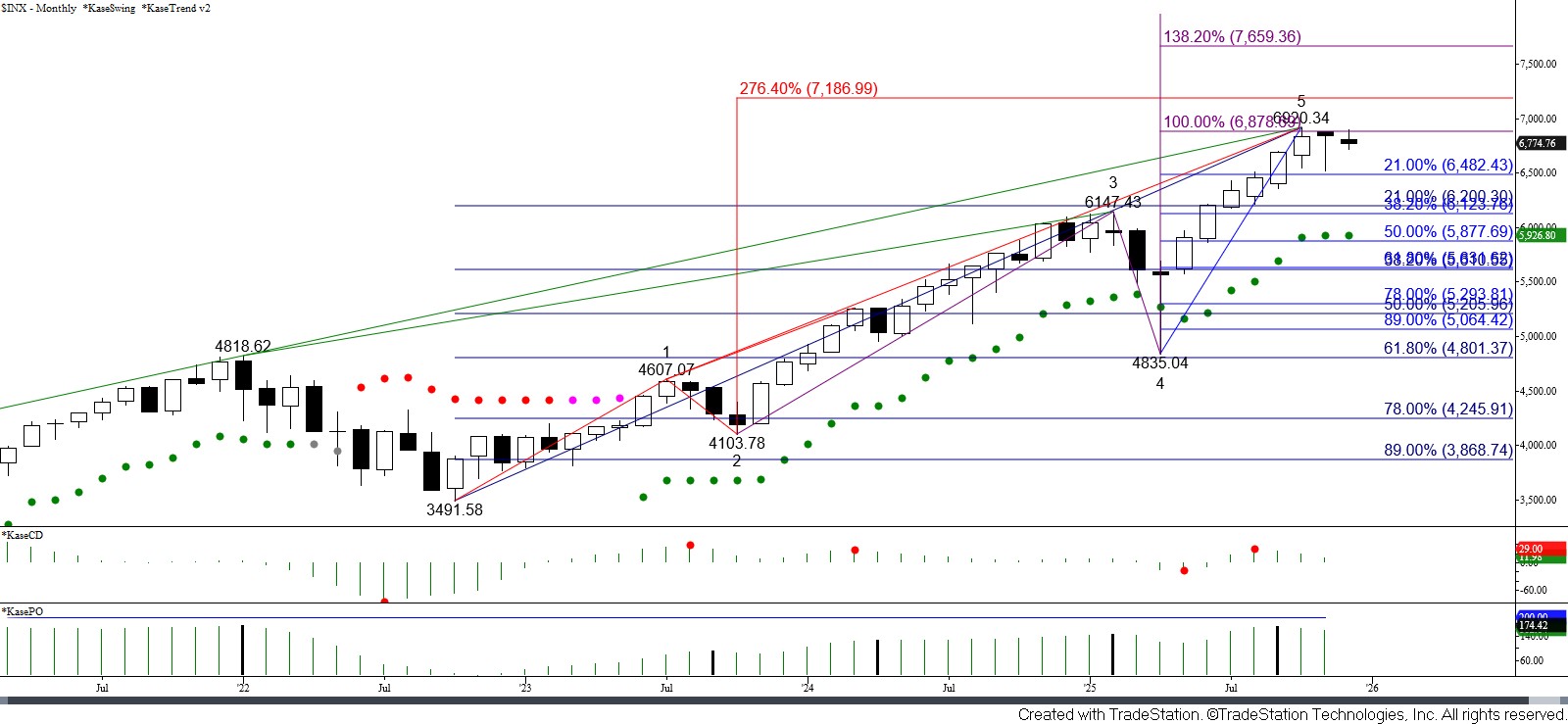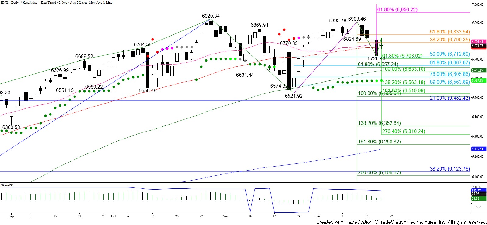 The weekly chart also confirmed bearish KasePO and RSI divergences at the $6920.34 high. More importantly, a double top between the $6920.34 and $6903.46 swing highs formed. This reversal pattern is significant for the outlook in the coming weeks. The $6501 level is key because it is in line with the $6521.92 confirmation point of the double top, the equal to (1.00) target of the wave down from $6920.34 (green), the 21 percent retracement of the rise from $4835.04 (blue), and the weekly Kase Trend bearish threshold (green dot). Closing below $6501 will confirm the double top and the monthly dragonfly doji, placing the S&P 500 Index on the ‘naughty list’ for at least a few weeks and perhaps longer.