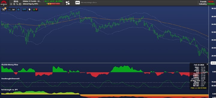 While a tactical short-term floor may be tentatively forming around the current $24 mark based on oversold readings and capitulation volume, any recovery attempts are highly likely to manifest as dead cat bounces rather than genuine trend reversals. The lack of buyer conviction is palpable across the entire software complex, as institutional capital continues its systematic rotation out of "Digital" assets and into the "Physicality" trade encompassing energy, industrials, and international equities. Expect BUG to remain a primary source of funding for this Great Rotation as the cybersecurity sector undergoes a painful but necessary valuation reset that could persist for multiple quarters.
