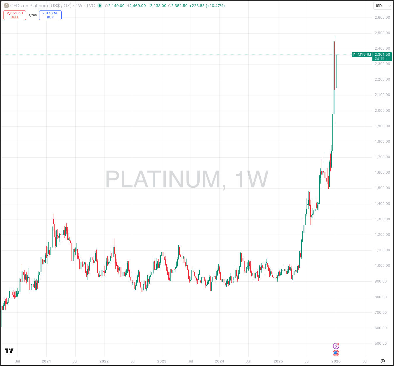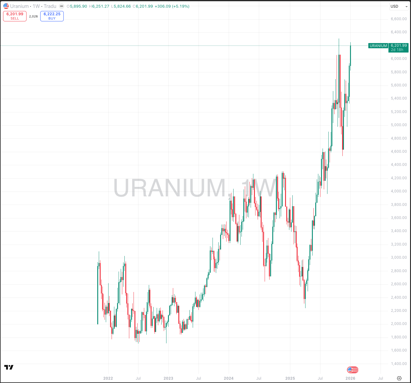 - Energy/Specialty: Uranium (USD) and Platinum (USD) continues their parabolic trajectory, supported by long-term structural deficits.