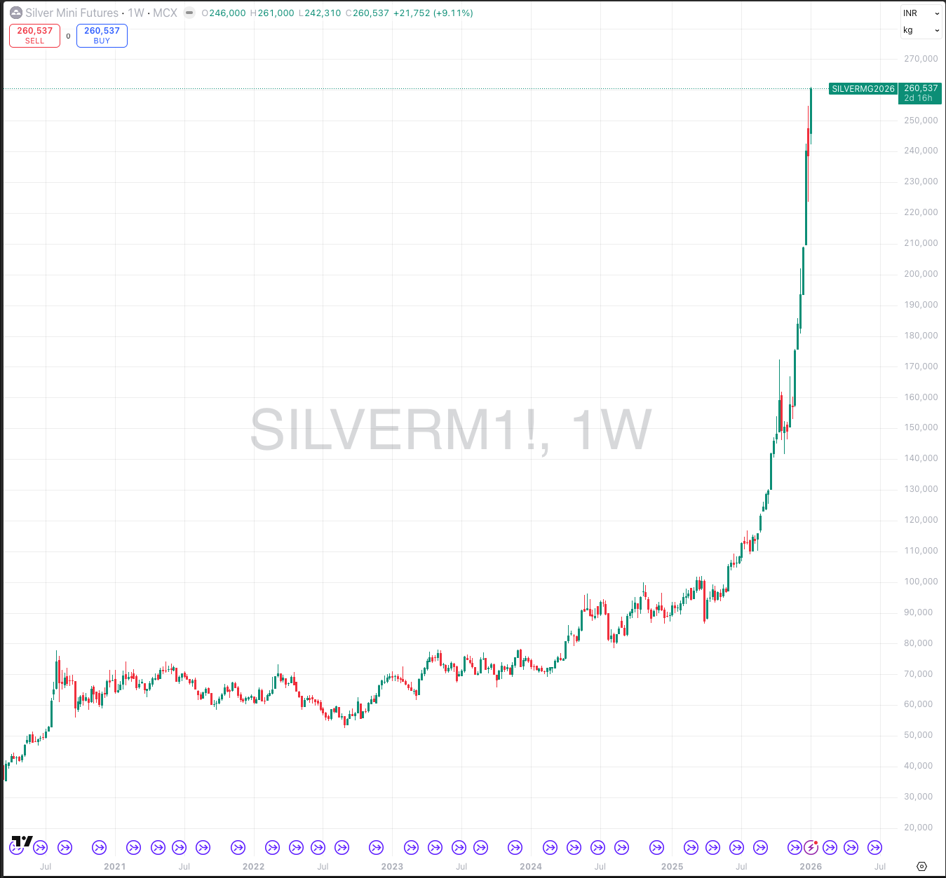 The spectacular returns in Gold and Silver throughout 2025—up 83% and 180% respectively—cannot be viewed in isolation. We are witnessing a perfect storm of soaring global spot prices compounded by a deteriorating INR/USD exchange rate.
