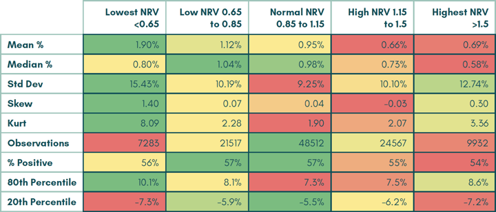 The results support the hypothesis that high NRV stocks have already priced in their prior month events. They tend to have weaker mean and median returns and distributions that are less skewed. This is also observed at the 80th percentile. Volatility rises for outliers at both the lowest and highest NRV observations.