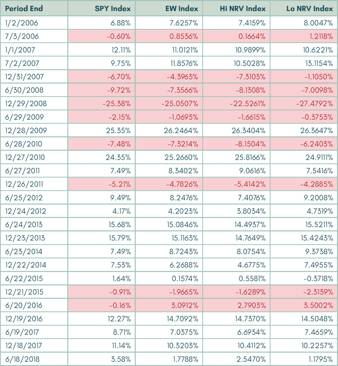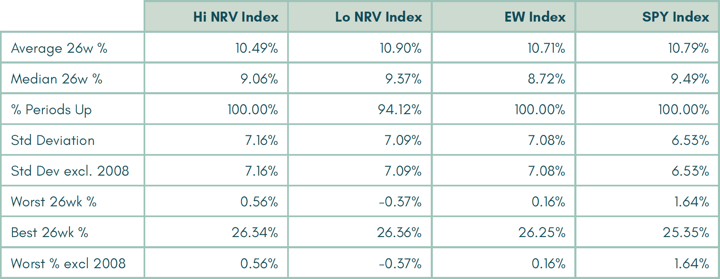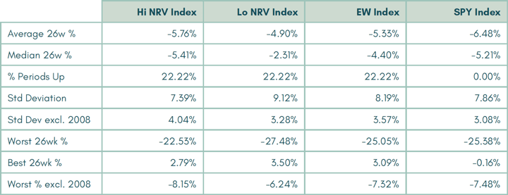 The Lo NRV Index performed best, averaging 5.43% during all 26-week periods. However, it had the highest standard deviation and the weakest single period. The 27.48% decline occurred between June 30, 2008 and December 29, 2008. The magnitude of this decline, relative to the others, can be partially explained by the Lo NRV’s relatively strong performance prior to this period. In the 52 weeks before June 30, 2008, the Lo NRV index had dropped just 8%, versus the Hi NRV index’s decline of nearly 15%. The Lo NRV stocks fell further and caught up to the market, possibly due to selling from margin calls. Removing the 2008 financial crisis from the test shows that the Lo NRV index offered the smallest 6-month drawdown and lowest volatility.