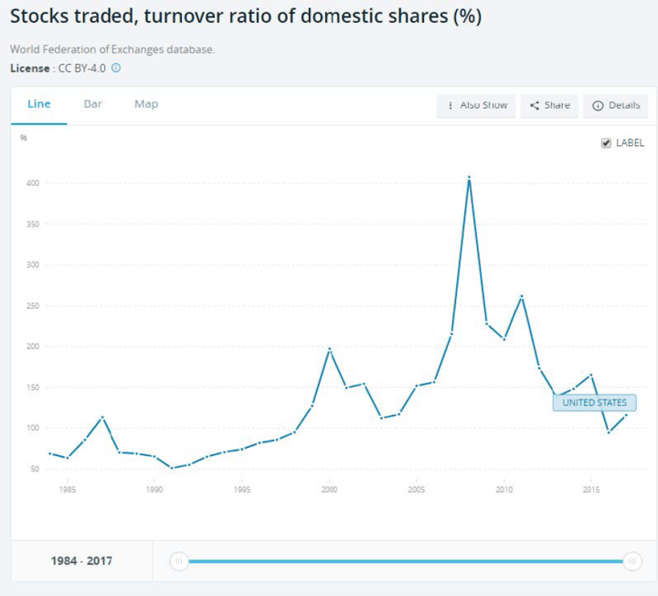 Chart 1: Stocks trades, turnover ratio of domestic shares (%), (1984-2017)