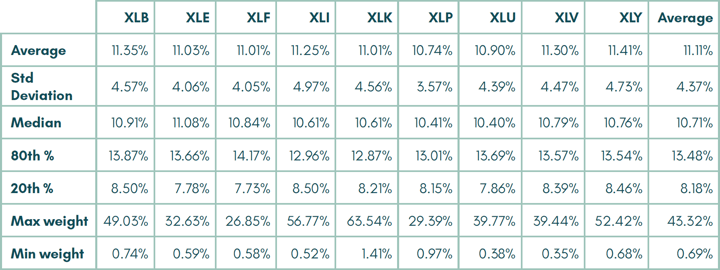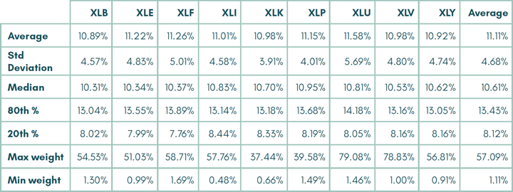The nine original State Street Global Advisors’ Select Sector SPDR ETFs were used to create three indexes. The selected ETFs track Global Industry Classification Standard (GICS) sectors and began trading in 1998. These ETFs were selected because of their long history, their high level of trading volume, and their effectiveness at tracking their chosen benchmarks. Together, they offer a broad look at the market and can be easily compared to the S&P 500. Although the portfolios underlying these funds are market cap weighted, it is unlikely that this impacted the results. Price data came from Yahoo! Finance and was adjusted for distributions. The State Street Global Advisors’ SPDR S&P 500 ETF Trust (SPY) ETF was used as a benchmark in order to remain consistent with ETF usage in the other indexes and because it is investable.