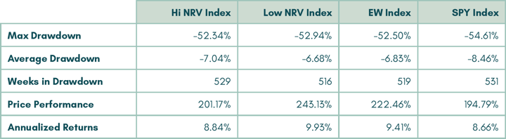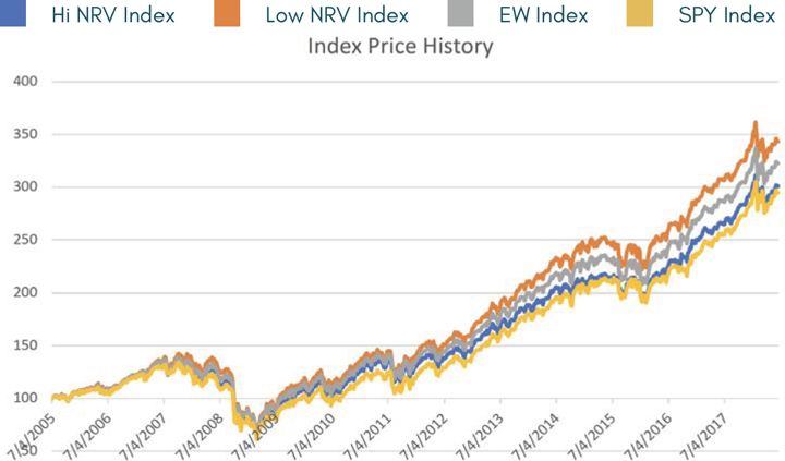Returns bear this out. During the test period, the Lo NRV index rose by 243.13% (9.93% annualized), easily beating the Hi NRV index, the EW Index, and the SPY Index. The Hi NRV Index gained 201.17%, beating only the SPY Index.