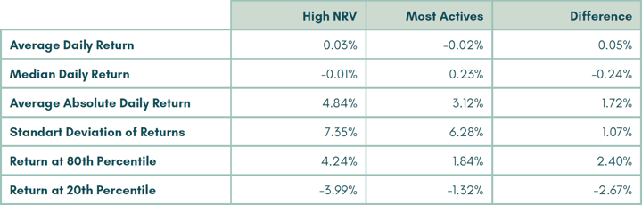 Comparing the returns from both lists, high NRV stocks tended to be more volatile on the event day, with a higher standard deviation of returns. Returns at the 80th and 20th percentiles show a spread of 8.23 percentage points vs. 3.16 percentage points for the Most Actives list. The absolute return is 1.72 percentage points higher for High NRV stocks, too.