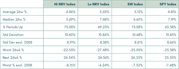 Low Normalized Relative Volume stocks outperform in bull markets, although with a narrow lead. The spread in 26-week returns between the four indices falls to just 0.41%, with the Lo NRV Index performing best, gaining 10.90%, and the Hi NRV Index returning 10.49%. Lo NRV, Hi NRV, and EW Indexes offered similar volatility that was almost 10% above that of the SPY Index.
