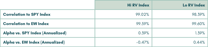 Each constituent in an index or portfolio using NRV weighting will have approximately equal weight over long periods of time, although the weight for any one period will fluctuate. For example, in the Lo NRV index, each of the nine constituents displayed an average weekly weighting of 11.11%. At the 80th percentile, weekly weights rose to 13.48% and fell to 8.18% at the 20th percentile. (See appendix B for table.) This is an improvement over turnover, where stocks tend to stay in the same quartile. NRV, through tactical weighting, offers additional potential to generate alpha. Both the Hi NRV Index and Lo NRV Index are strongly correlated with the SPY Index and the EW Index. This is expected as the underlying ETFs can be aggregated to closely approximate the S&P 500 Index’s returns and implies that all differences in returns are due to portfolio construction.