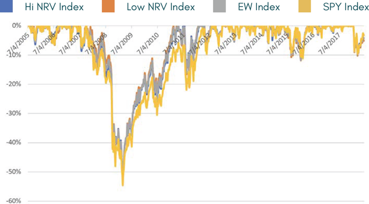 Drawdown was comparable across all three indices, however, the Lo NRV index spent fewer weeks in drawdown. It was later to decline and, in the case of the financial crisis, quicker to rebound and set a new all-time high.