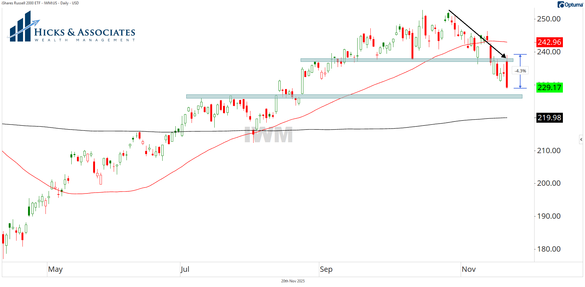 Next, note that Thursday’s action attempted to get back above that level that I’ve highlighted with the blue-gray box. Not only could it not hold that level, but IWM printed a pretty bearish engulfing pattern. And it’s not far from what I would consider the next level of support (lower blue-gray box). And that support isn’t too far from the 200-day moving average. So, I will not be surprised if the 200-day gets tested next week.