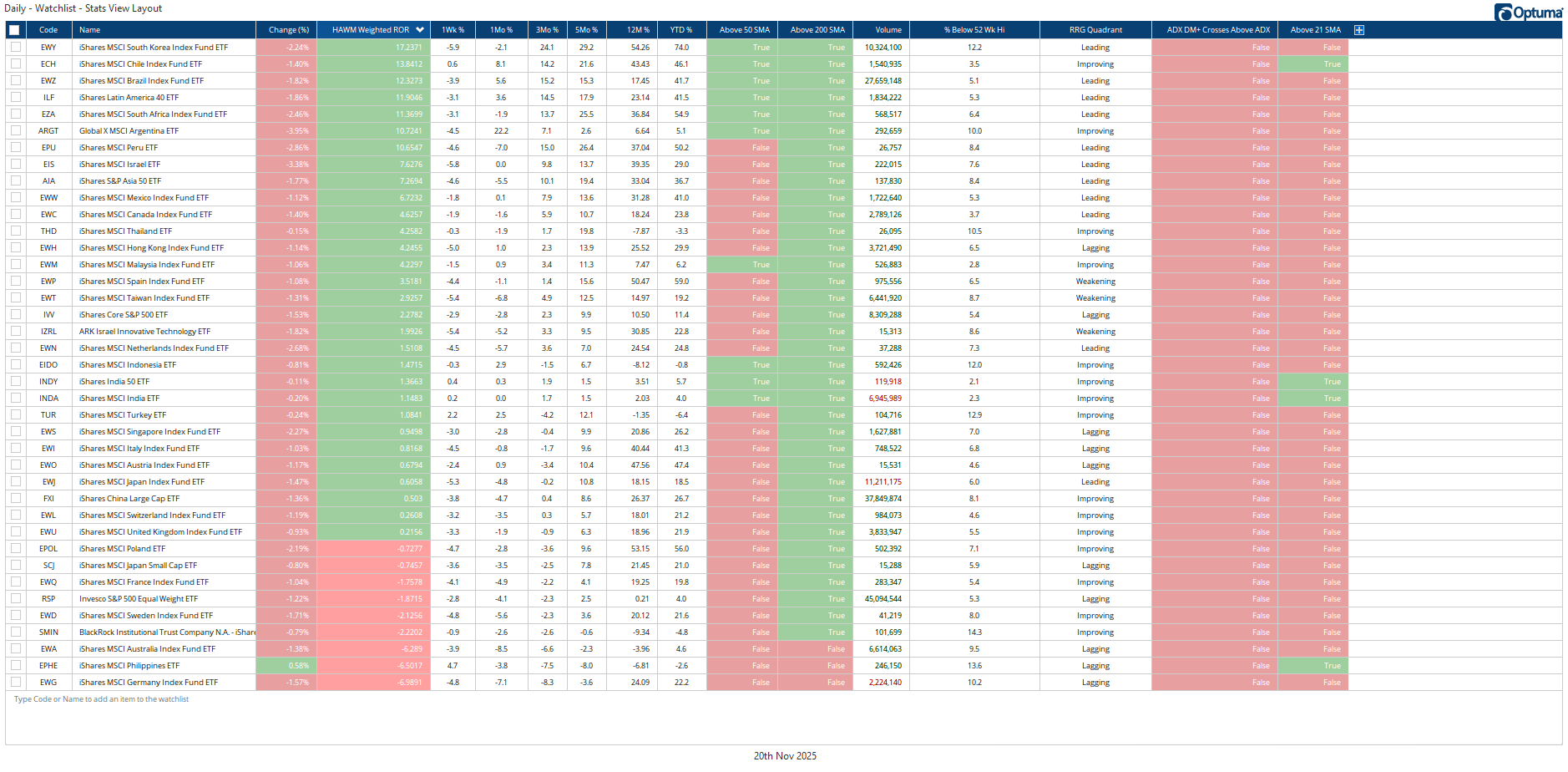 This is a table of Single-Country ETFs that I monitor. My theory is that clients are paying me to actively manage their wealth. So, if the U.S. is in a bear market, I want to try to find a bull market somewhere. The problem, as I discuss in my book, is that in bear markets correlation goes to one. In other words, in today’s highly integrated global economy, there is a high degree of correlation. According to this table, only the Phillippines were positive on Thursday.