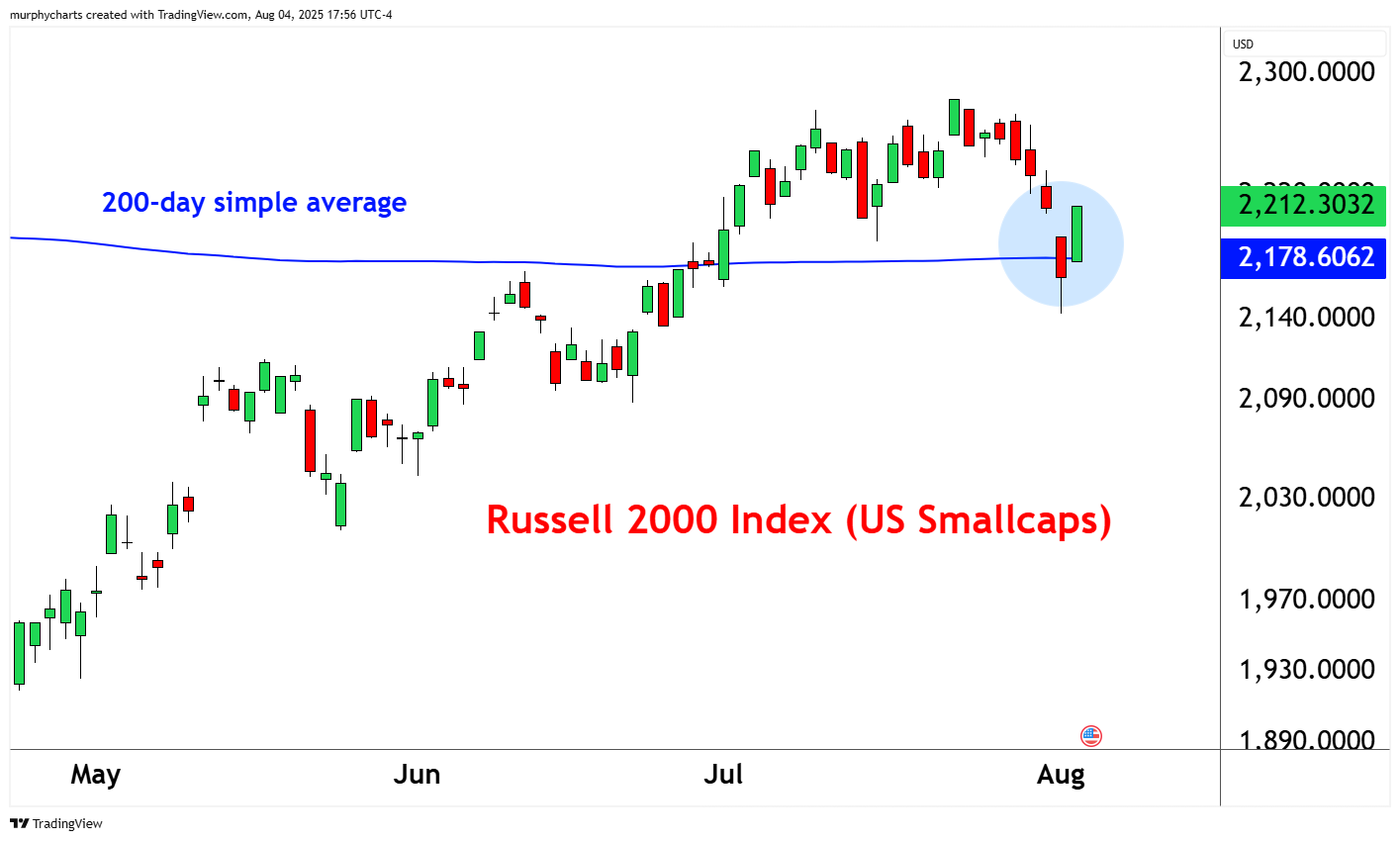The Russell 2000 small-cap index closed below its 200-day average on Friday 8/1, after a 20-point opening gap lower. By the close of Monday’s trading, buyers filled the gap pushing prices back above Thursday’s closing price.