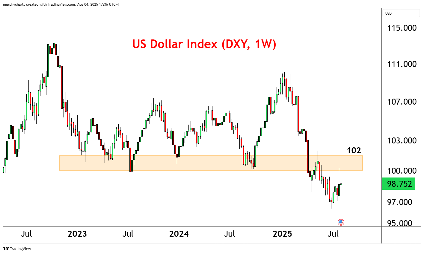 The US Dollar Index continues to trade below a well-tested support/resistance zone ~100. The decline in the dollar has aided international equity funds that are denominated in USD. If the downtrend continues, it will provide a major tailwind to the category.