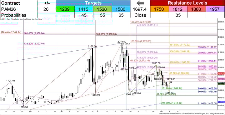The June palladium contract has a bearish lean for the coming weeks. However, the outlook is tight because prices are trying to form a base around $1560, which is in line with the $1555 swing low that formed before the rise to the $2219.5 contract high.