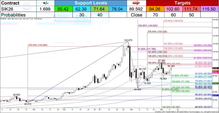 Silver’s historic pullback that occurred in late January sent a shockwave through the markets and headlines. The 50-day moving average initially held, but the move down extended in early February to test and hold the 62 percent retracement of the rise from the May 2026 contract’s $29.261 (dark blue) contract low. Since then, prices have worked their way higher and have recaptured both the 20- and 50-day moving averages within the past several days. Although the 20-day moving average crossed below the 50-day, which is bearish, the two simple moving averages are still in a tight range, and the close above them was bullish for the outlook.