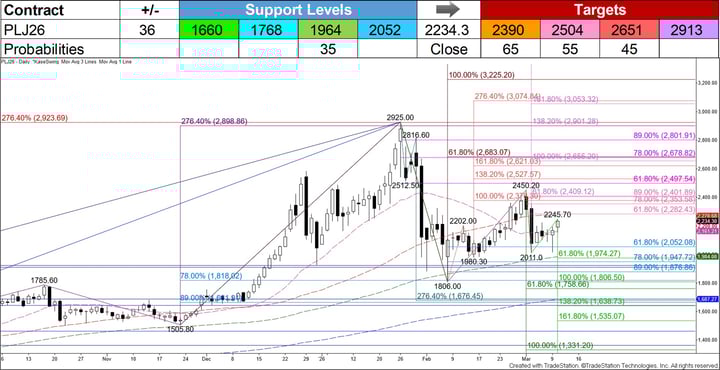 Like silver, the April 2026 platinum contract initially tried to hold the 50-day moving average during the pullback in late January. However, prices eventually closed below this threshold, challenging the 100-day moving average. This level and a few important retracements in that area held on a closing basis. Platinum is working its way higher but is still trading below the 62 percent retracement of the decline from $2925 (magenta). Therefore, the move up might prove to be the corrective leg of a significant primary wave down from $2925 (green).